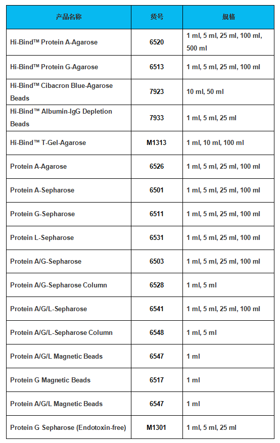 BioVision公司生產(chǎn)的 Hi-BindTM T-Gel Agarose beads 是T-gel 瓊脂糖凝膠法,具有很高的蛋白結(jié)合能力,可達30mg蛋白/ml beads。同時,可兼容多種樣本,任何類型的免疫球蛋白都可純化,如來自血清、腹水、組織或細胞培養(yǎng)液等樣本中的IgG, IgE, IgM, IgA, IgY 和Fab 片段等。