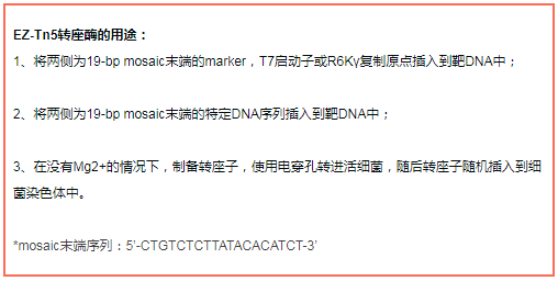 EZ-Tn5轉(zhuǎn)座子可在體外插入到含有靶DNA的載體。當(dāng)EZ-Tn5轉(zhuǎn)座子在沒有鎂離子孵育時(shí),形成穩(wěn)定的EZ-Tn5轉(zhuǎn)座體復(fù)合體,可以被電擊進(jìn)入活細(xì)胞,一旦進(jìn)入細(xì)胞中,轉(zhuǎn)座體由細(xì)胞內(nèi)鎂離子活化,就能隨機(jī)插入到宿主的基因組DNA中。