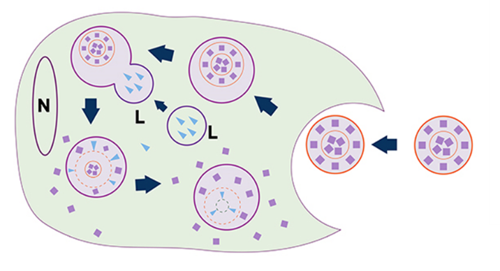 圖. Clophosome?巨噬細胞耗竭的原理。包裹著氯磷酸的脂質(zhì)體Clophosome?借助巨噬細胞的內(nèi)吞作用進入細胞,與溶酶體融合后,在磷酸酶的作用下,釋放出氯磷酸,當細胞內(nèi)的氯磷酸濃度達到一定閾值,就會對巨噬細胞造成不可逆轉(zhuǎn)的損害,從而迫使其進入細胞凋亡程序。