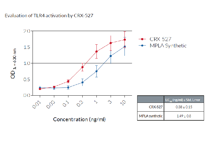 將細(xì)胞分別與遞增濃度的CRX-527、合成的單磷酰脂質(zhì)A(MPLA)孵育。在HEK-BlueTM檢測培養(yǎng)基(SEAP檢測生長培養(yǎng)基)中孵育過夜后,通過測定上清液中是否存在SEAP來評(píng)估TLR4的活化。數(shù)據(jù)表示為OD(λ=630nm)(±SEM)