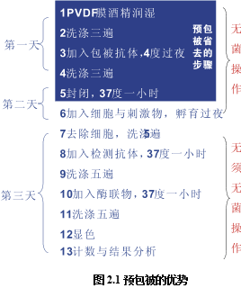 如圖2.1所示,預(yù)包被有著明顯的技術(shù)優(yōu)勢。PVDF板的ELISPOT試驗一共需要3天時間,采用預(yù)包被板可以節(jié)省一天的時間,當(dāng)天處理細胞,當(dāng)天上板檢測;未包被的檢測共有13步,預(yù)包被可以省掉其中的5步,并且這5部都是需要無菌操作的步驟,占整個無菌操作步驟的5/6。節(jié)省時間只是其一,由于減少了無菌操作的步驟,使得整個實驗污染與出錯的概率大大降低,提高了整體試驗的成功率。