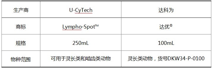 目前,我們同時(shí)提供U-CyTech原產(chǎn)的Lympho-Spot?無血清培養(yǎng)基和U-CyTech授權(quán)達(dá)科為在國(guó)內(nèi)生產(chǎn)的達(dá)優(yōu)?無血清培養(yǎng)基。它們的原料來源與質(zhì)控標(biāo)準(zhǔn)完全相同,能獲得同樣出色的檢測(cè)結(jié)果。由于物種的差異,部分添加成分在靈長(zhǎng)類和嚙齒類之間有差別。U-CyTech公司采取了同時(shí)添加的策略,所以生產(chǎn)出的是通用達(dá)優(yōu)?無血清培養(yǎng)基;達(dá)科為公司采取的是分別添加的策略,所以生產(chǎn)出的是專用達(dá)優(yōu)?無血清培養(yǎng)基,分靈長(zhǎng)類和嚙齒類兩個(gè)品種。詳細(xì)的差別見下表。