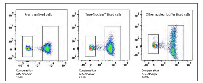 主要表現(xiàn)在固定劑對(duì)串聯(lián)染料(tandem-dye,如APC/Cy7、PE/Cy7等)的影響:一個(gè)是固定劑有可能造成串聯(lián)染料的斷裂,比如APC-Cy7和4%多聚甲醛溶液接觸時(shí)間超過(guò)4個(gè)小時(shí)染料就有可能斷裂,所以如果細(xì)胞直接重懸在固定液里面建議盡快上機(jī),如果要放到第二天上機(jī),需離心去除固定液后重懸在流式染色液或者是PBS里面,當(dāng)然有一些新的串聯(lián)熒光素可以有效減少這種情況,比如BioLegend的APC/Fire750TM染料。