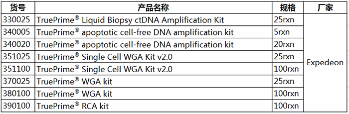 擴(kuò)增能力強(qiáng),無引物互作,無擴(kuò)增偏倚,覆蓋率高,保真性好,重復(fù)性好,集諸多優(yōu)勢于一身的TruePrime?,還有什么理由不選擇呢?TruePrime?會為您的單細(xì)胞測序工作帶來極大的便利!除此之外,Expedeon還提供用于擴(kuò)增cfDNA, circular DNA等多種類型DNA的試劑盒喲!