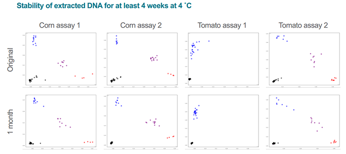 △圖2. 用QuickExtract從玉米和番茄中提取的DNA用KASP基因分型技術(shù)進(jìn)行聚類(lèi)(Original),然后在4℃下儲(chǔ)存1個(gè)月,再將樣品進(jìn)行聚類(lèi)(1month) ,實(shí)驗(yàn)結(jié)果完全一致。