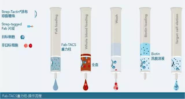 Fab-TACS重力柱內(nèi)裝有經(jīng)Strep-Tactin?涂布的細(xì)胞級中型瓊脂糖珠(cell-grade agarose matrix),如此一來,含有Twin-Strep-tag?的Fab片段(Fab-Streps)能與瓊脂糖珠結(jié)合。將全血或血液樣本加入重力柱,此時目標(biāo)細(xì)胞會與Fab-Streps進行特異性結(jié)合,非目標(biāo)細(xì)胞則會直接流出。隨后,清洗重力柱將多余的非目標(biāo)細(xì)胞或血液雜質(zhì)洗去。最后,加入生物素(biotin)中斷Fab-Streps與Strep-Tactin?間的結(jié)合,與此同時,低親和力的Fab-Streps也會從目標(biāo)細(xì)胞上解離,而您便能獲得不含標(biāo)記、幾近原始的目標(biāo)細(xì)胞來進行后續(xù)的實驗。