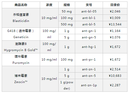 圖1 InvivoGen基因篩選抗生素
