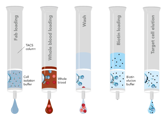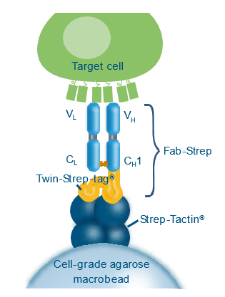 Fab-TACS柱子填充了包被有Strep-Tactin? 多聚體的細(xì)胞級(jí)瓊脂糖基質(zhì),偶聯(lián)上Strep-tag的Fab片段(Fab-Streps)特異性的結(jié)合到瓊脂糖基質(zhì)上。隨后,加入全血或其他血液制劑流過柱子。目的細(xì)胞通過特異性的與Fab-Streps作用從而結(jié)合到瓊脂糖基質(zhì)上,其他非目的細(xì)胞則有效的被洗去。最后,加入生物素使目的細(xì)胞從Fab-Streps上解離。至此,就已分離得到不帶任何標(biāo)記的、真實(shí)的目的細(xì)胞可用于下游的實(shí)驗(yàn)研究。