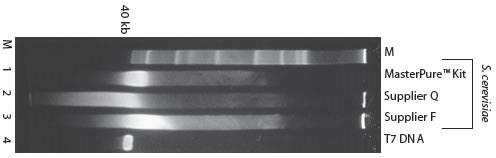1%瓊脂糖膠電泳分析不同試劑盒提取純化啤酒酵母的500ng DNA,使用EB進行染色。用MasterPure? Kit分離的DNA的大小絕大多數(shù)在40-50 kb范圍內。用其它試劑盒提取的DNA會降解成更小的片段。