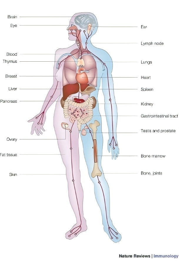 起初,T 細胞被認(rèn)為是免疫系統(tǒng)中 MIF 的主要細胞來源。然而,后來的文獻證明了單核細胞、巨噬細胞、血液中的樹突狀細胞、B 細胞、中性粒細胞、嗜酸性粒細胞、肥大細胞和嗜堿性粒細胞均表達MIF。值得注意的是,MIF 也由與宿主自然環(huán)境直接接觸的細胞和組織表達,例如肺、皮膚上皮層以及胃腸道和泌尿生殖道。其另一個顯著特征是在內(nèi)分泌系統(tǒng)的幾個組織中高水平表達,尤其是參與應(yīng)激反應(yīng)的器官(下丘腦、垂體和腎上腺)。