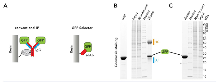 傳統(tǒng)的GFP融合蛋白免疫沉淀是基于與GFP特異性抗體非共價(jià)鏈接的protein A或protein G結(jié)合在固相,從而拉下蛋白的原理(見圖1 A),其產(chǎn)率和效率通常受限于一抗的特異性和固相上protein A/G的結(jié)合能力。通常,在用SDS緩沖液洗脫時(shí),抗體發(fā)生變性并與GFP融合蛋白及相互作用的配體一起從樹脂上分離下來。因此,洗脫液中通常含大量一抗重鏈和輕鏈(見圖1 B),妨礙鑒定蛋白的相互作用,還有可能影響下游實(shí)驗(yàn),比如蛋白質(zhì)印跡或質(zhì)譜分析。