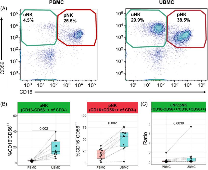 Kahn等人采用了一種從胎盤床收集白細胞的技術,即在剖腹產(chǎn)后使用手術海綿擦拭子宮腔。這種方法通常用于確保胎盤從子宮腔中完全移除并清除多余血液,因此不會給患者帶來額外的風險。本文采用這種方法分析胎盤床NK細胞、T細胞、B細胞和單核細胞的表型,并與外周血樣本中對應細胞進行比較。